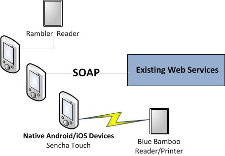 The target architecture was to have the Android and iOS native devices communicate with existing SOAP web services infrastructure. The native devices would then have the option to use either the Rambler Reader to take credit card transactions, or the Blue Bamboo Reader/Printer to take and print credit card transactions over bluetooth.